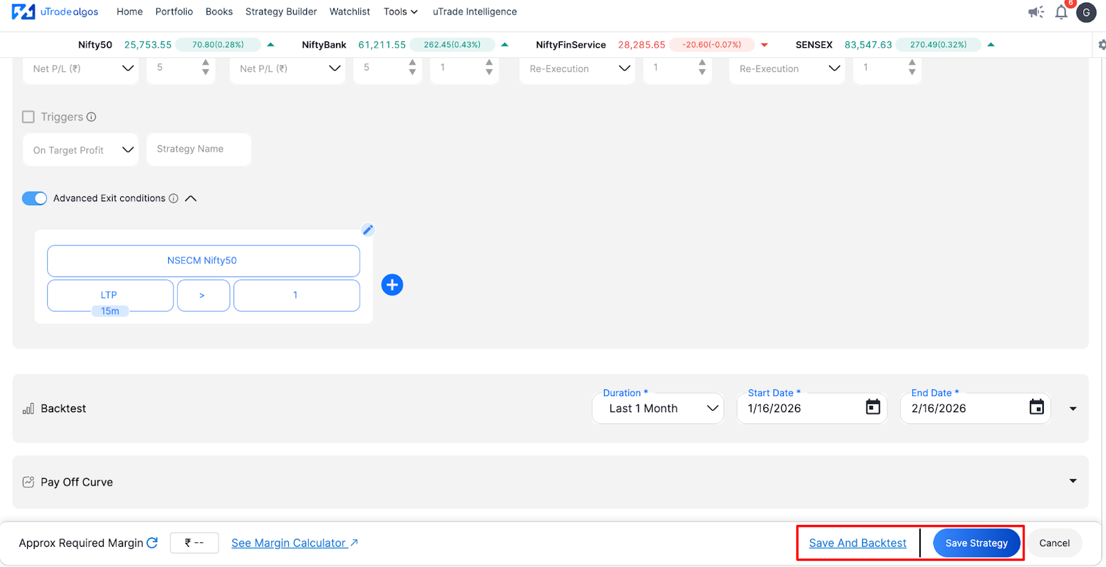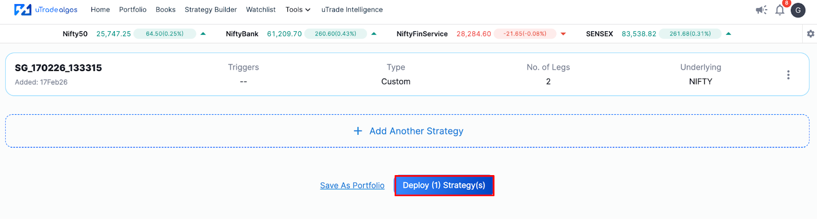 Save Strategy: Permanently saves to your uTrade Algos portfolio. You can deploy it anytime with one click, making it easy to maintain a library of strategies for different market scenarios.