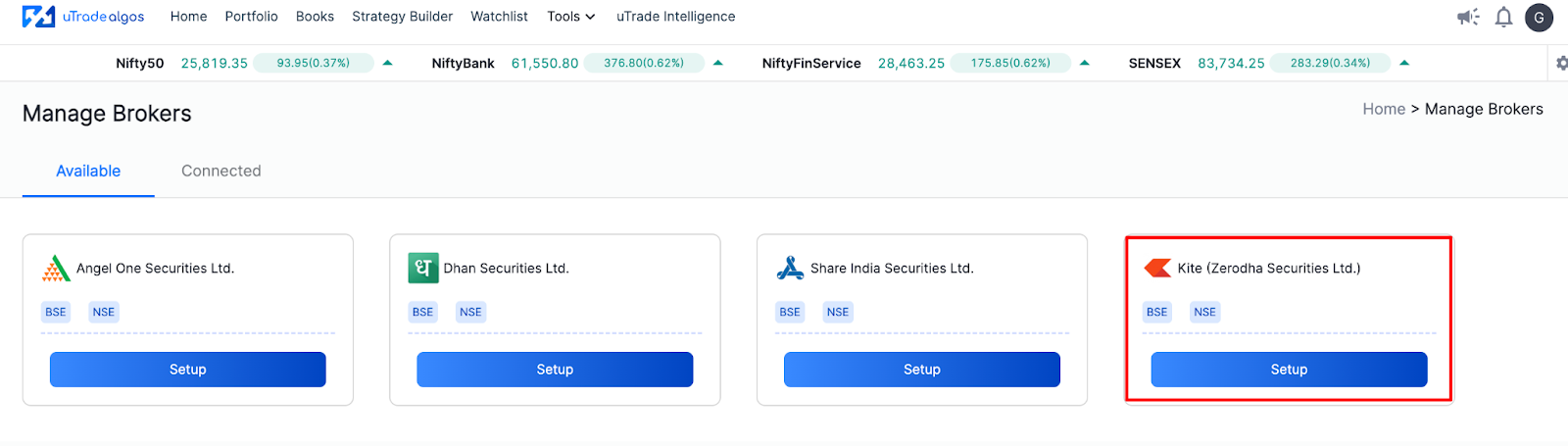 Click on the Setup button associated with the Zerodha (Kite) card. This initiates the broker connection configuration process.