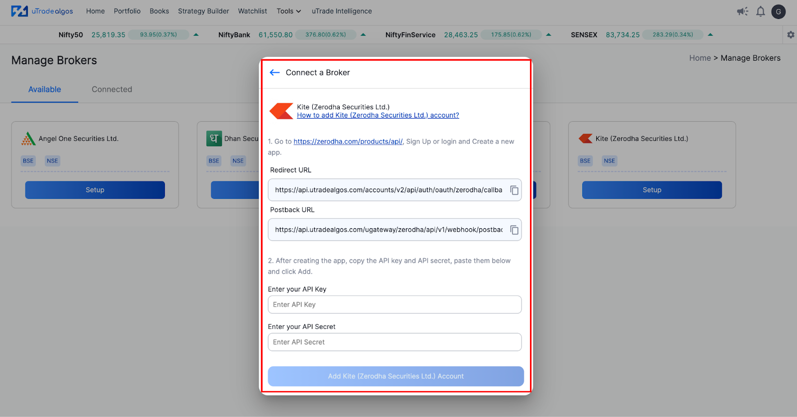 - Once the API Key and API Secret are generated, copy them and enter the details in uTrade Algos along with your Zerodha account information.