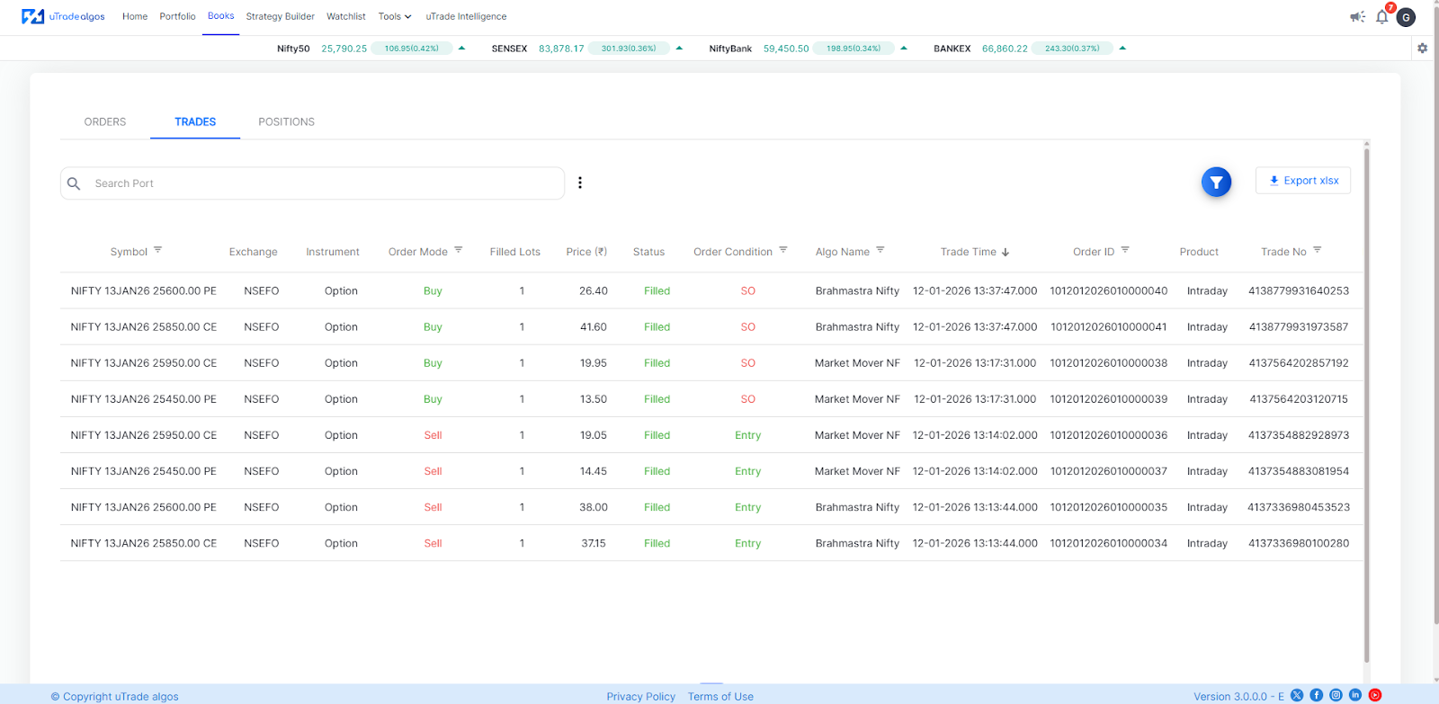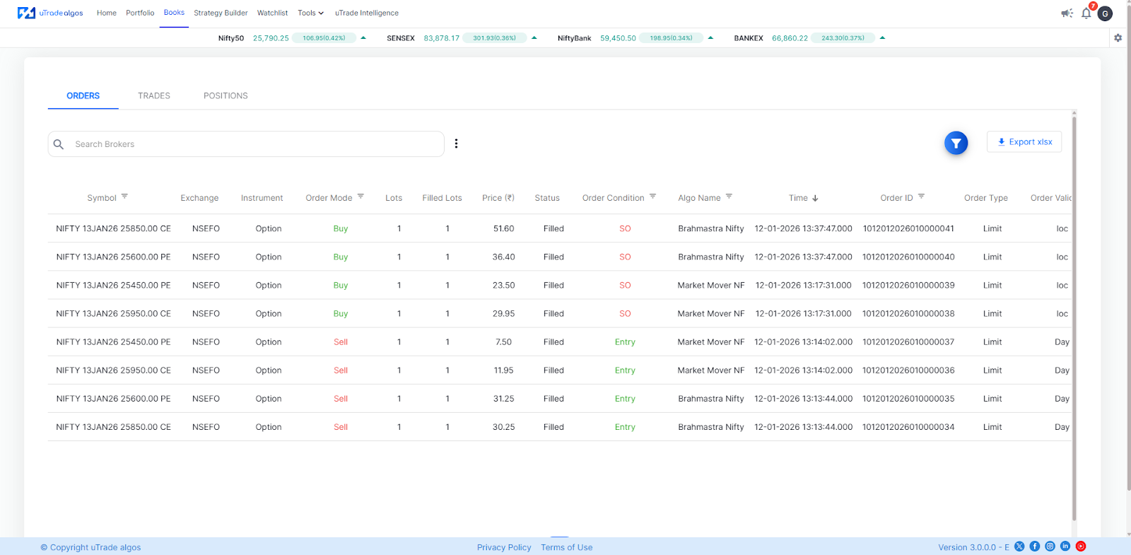 The Books section shows the Orders and Trades placed along with Net Positions of all the strategies/portfolios deployed. You can access this section by clicking on the ‘Books’ button of the header tab.